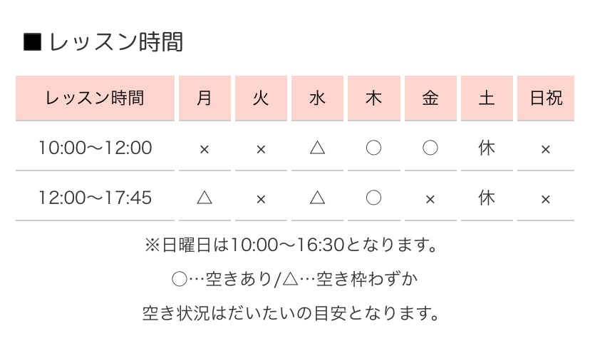 私としてはもう少しレッスン枠を広げていきたいのですが、まだ小さい息子がおり現在は17:45までのレッスン時間とさせていただきます。